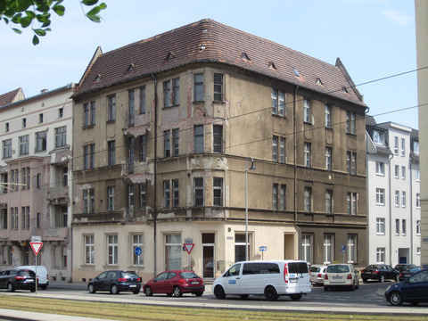Das viergeschossige Eckgebäude wurde als Wohn- und Geschäftshaus etwa 1925 in Massivbauweise errichtet. Die im Art-déco-Stil überformten Straßen­fassaden sind als einfache Stuckfassaden mit profi­lierten Gurt-, Sohlbank- und Traufgesimsen sowie mit Fensterverdachungsfeldern und glatten Pilas­tern ausgebildet. Im Erdgeschossbereich sind die Fenster mit profilierten Fensterbänken und Faschen betont. Das asymmetrische Berliner Dach besteht aus einem zur Hofseite leicht geneigten Pultdach und einer zur Straße walmdachförmigen Steilab­schrägung.