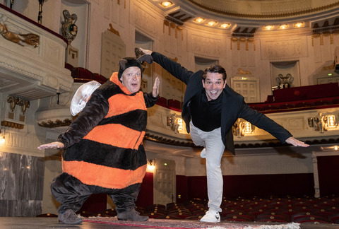 Hummel Mats und Moderator Juri Tetzlaff im Großen Haus, Foto: Bernd Schönberger, Lizenz: Brandenburgische Kulturstiftung Cottbus-Frankfurt (Oder)