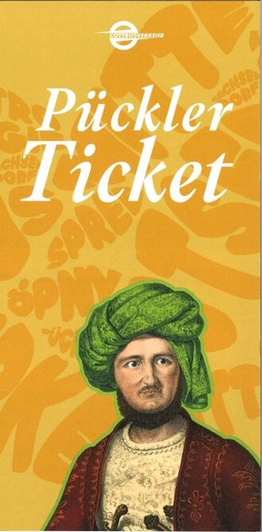 Flyer mit Informationen zum Pücklerticket und zur Pücklerlinie ab Hauptbahnhof Cottbus über die Innenstadt bis nach Branitz und zurück, Übersicht aller ermäßigten Leistungen, für die das Pücklerticket gilt