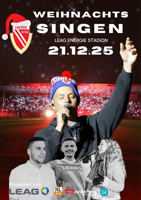 Der FC Energie Cottbus verwandelt das LEAG Energie Stadion auch in diesem Jahr wieder in einen Ort voller Lichter, Musik und Gemeinschaft. Das mittlerweile nun schon traditionelle Weihnachtssingen wird am Sonntag, 21. Dezember 2025 stattfinden und verspricht erneut ein stimmungsvolles Erlebnis für die ganze Familie.