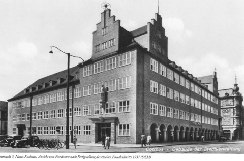 Znaczny wzrost liczby mieszkańców miasta Cottbus, który rozpoczął się w latach 70-tych XIX wieku, wiązał się ze wzrostem zadań administracyjnych. Dla przykładu miasto liczyło sobie w 1900 roku prawie 40.000 mieszkańców. Zaistniały stan rzeczy przyczynił się w 1934 roku do rozpoczęcia budowy nowego ratusza (1934-1936), będącego uzupełnieniem pomieszczeń starego i już nieistniejącego ratusza na Starym Rynku. W związku z budową nowego obiektu wyburzono budynki mieszkalne, w tym dom rodzinny malarza Carla Blechen (Berliner Platz 5/ tablica pamiątkowa).
